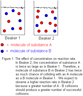 In general, increasing reactant concentrations increases the reaction rate. This is because molecules must collide in order to react. The more concentrated the reactants, the greater the number of molecules in any given volume, and therefore, the greater the number of molecular collisions. Not every molecular collision between reactant molecules will lead to reaction, but some fraction of them will. Certainly, increasing the total number of molecular collisions will increase the number of successful collisions. We define "successful collisions" as those which lead to chemical reaction.