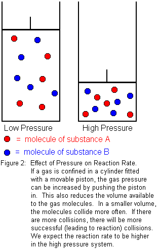 If the substances involved in the reaction are gases, pressure will have an effect on reaction rate. For solids and liquids, the effect is negligible, because solids and liquids are essentially incompressible. Gases are readily compressible, however, so pressure acts as a kind of "concentration" for gases. We know from Boyle's law that the volume of a gas decreases as the pressure increases. For a given amount of gas, increasing the pressure means we are forcing the same number of gas molecules to occupy a smaller volume. In the smaller volume, the molecules will collide more often, which means there will be a greater number of successful (leading to reaction) collisions in a given period of time. We expect reaction rate to increase with pressure.