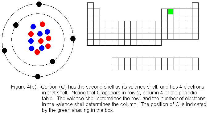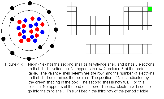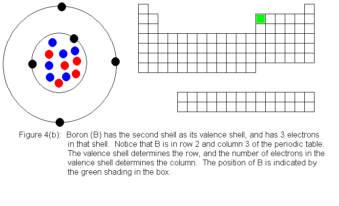 The arrangement of elements in the periodic table is based on the chemical properties of the elements. The chemical properties, in turn, are determined mainly by the number of electrons in the valence shell. One reason we can be so confident in our modern understanding of the electronic structure of the atom is that it explains the periodic table so well. The next several pictures show Bohr model drawings of atoms, and an outline of the modern periodic table, with the element's position highlighted.